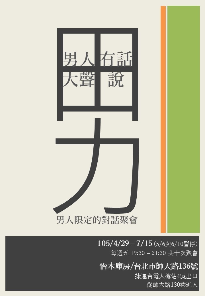 邀請對象 20歲以上男性,願意參與團體並分享個人生命經驗者